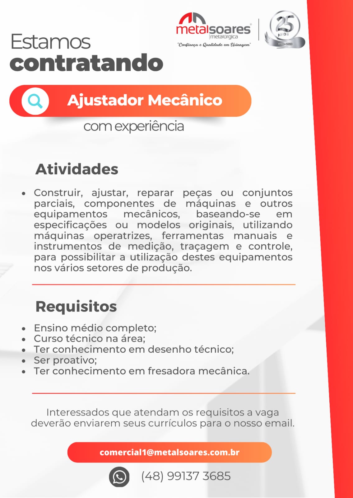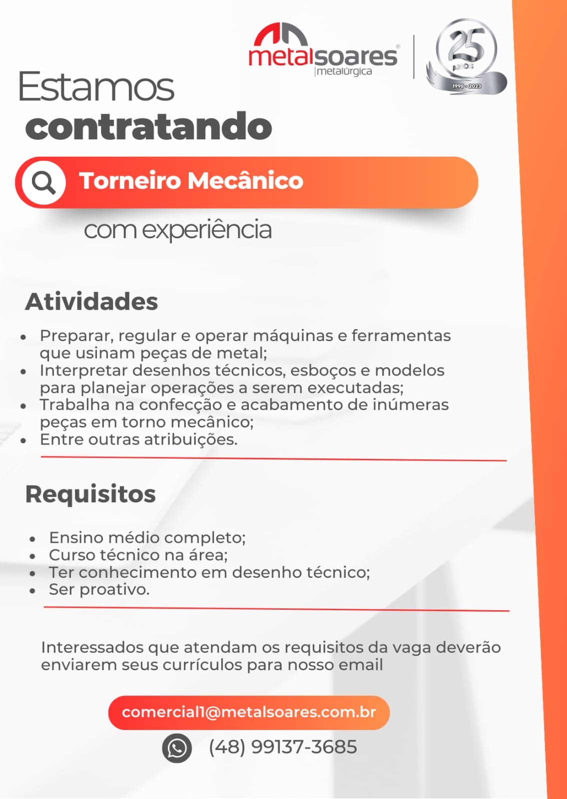 É com gratidão e satisfação que chegamos aos 25 anos de muito trabalho e desafios superados. Seguiremos na luta para continuar fazendo da nossa empresa referência. Agradecemos imensamente aos nossos clientes que diariamente nos escolhem e confiam em nosso trabalho, aos nossos fornecedores que acreditam em nossa parceria e aos nossos colaboradores que se dedicam constantemente em prol de todas as metas a que nos propomos. Que o futuro nos reserve novos desafios e que venham mais 25 anos de parceria e sucesso à todos. Obrigado!